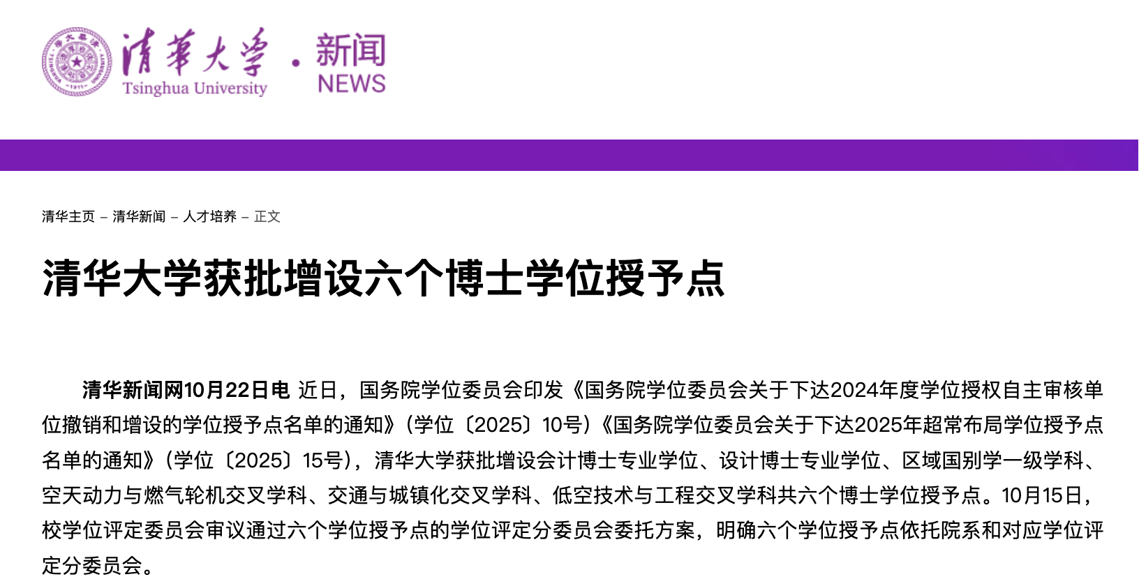 據(jù)清華大學(xué)新聞網(wǎng)消息,近日,國務(wù)院學(xué)位委員會印發(fā)《國務(wù)院學(xué)位委員會關(guān)于下達(dá)2024年度學(xué)位授權(quán)自主審核單位撤銷和增設(shè)的學(xué)位授予點(diǎn)名單的通知》(學(xué)位〔2025〕10號)《國務(wù)院學(xué)位委員會關(guān)于下達(dá)2025年超常布局學(xué)位授予點(diǎn)名單的通知》(學(xué)位〔2025〕15號),清華大學(xué)獲批增設(shè)會計博士專業(yè)學(xué)位、設(shè)計博士專業(yè)學(xué)位、區(qū)域國別學(xué)一級學(xué)科、空天動力與燃?xì)廨啓C(jī)交叉學(xué)科、交通與城鎮(zhèn)化交叉學(xué)科、低空技術(shù)與工程